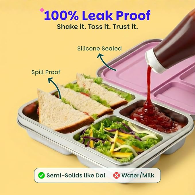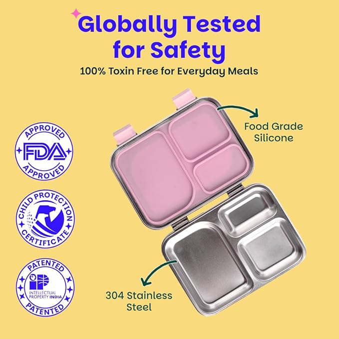 • Safe & Non-Toxic Materials: Your child’s well-being is our top priority. Our bento lunch box for kids is made from premium food-grade 304 stainless steel, FDA-approved food-grade silicone, and BPA-free materials. Every bite from our Steel tiffin box for kids guarantees peace of mind.