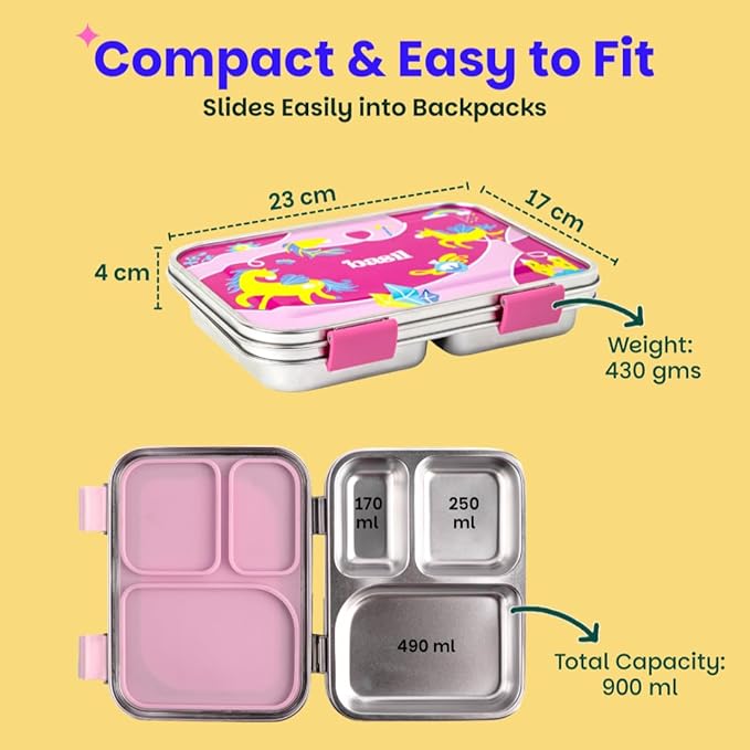 Bento Box - 900 ml 3 Compartment Stainless Steel Lunch Box for Kids | Leak-Proof Tiffin for School - Pink Unicorn | Pixie DashBento Box – 900 ml 3 Compartment Stainless Steel Lunch Box for Kids | Leak-Proof Tiffin for School – Pink Unicorn | Pixie Dash