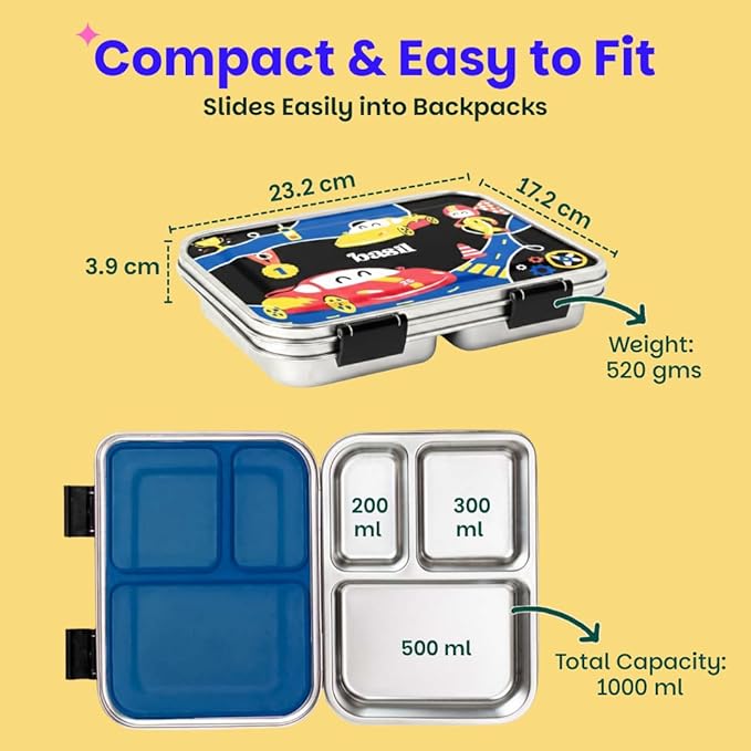 Bento Neo Classic 2025 – New & Improved, 1000ml 3-Compartment Stainless Steel Lunch Box for Adults, Teens & Kids | Leak-Proof & Easy to Open Tiffin for Office, School, College – Black Car
