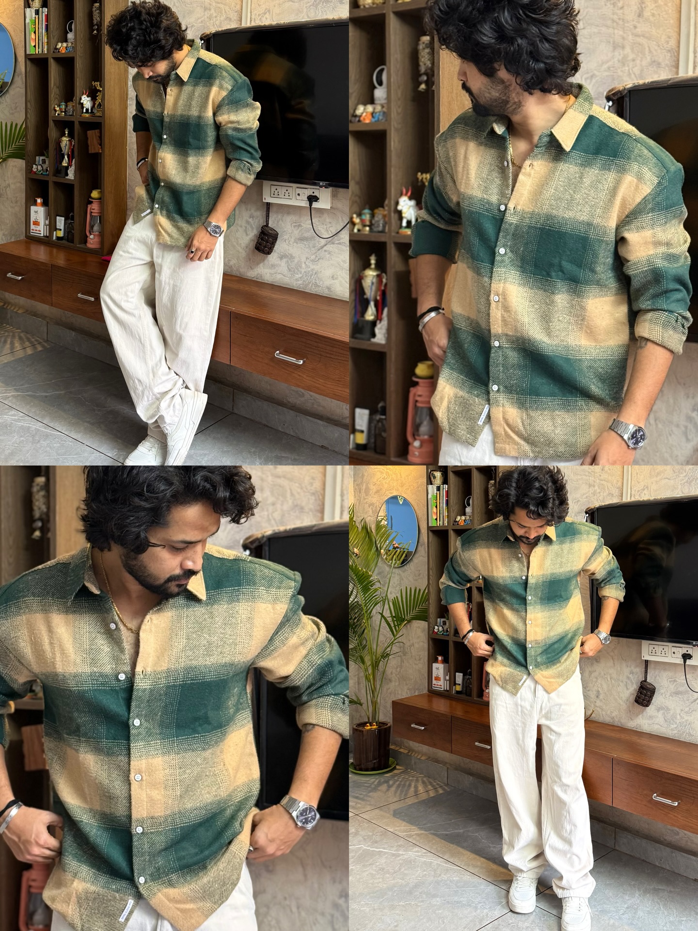 The Fluid Contrast: Pair this heavy top with off-white or cream wide-leg linen trousers to brighten the ensemble and highlight the ochre tones in the plaid.