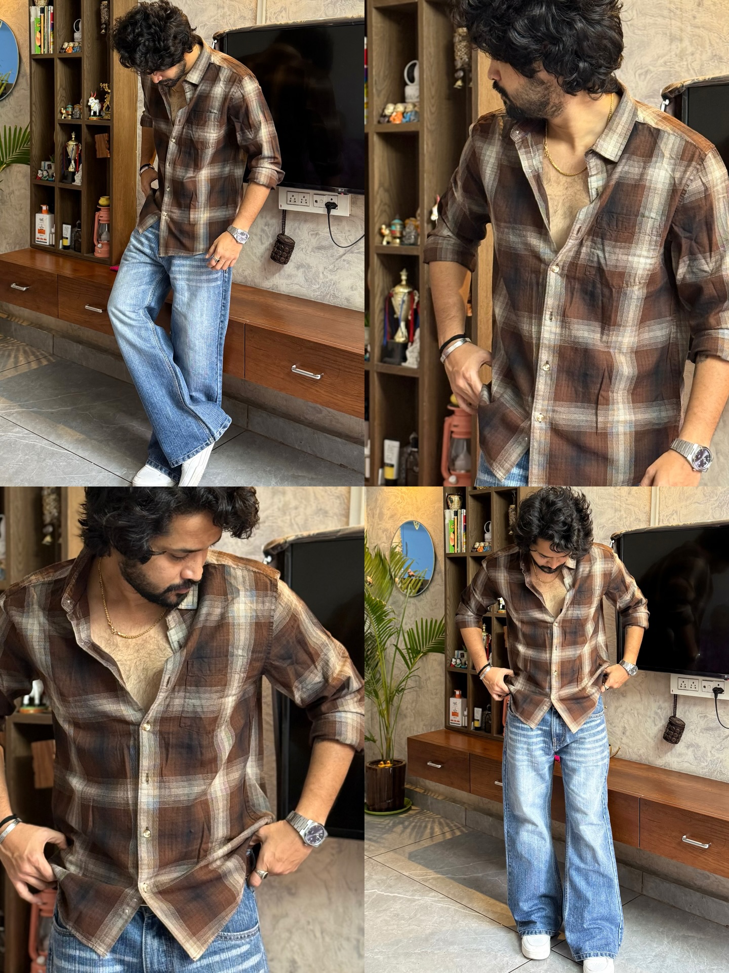 1. The Blue Contrast: Pair this earthy top with relaxed-fit light-wash blue denim to ground the warm brown tones and create a balanced, heritage-inspired palette.