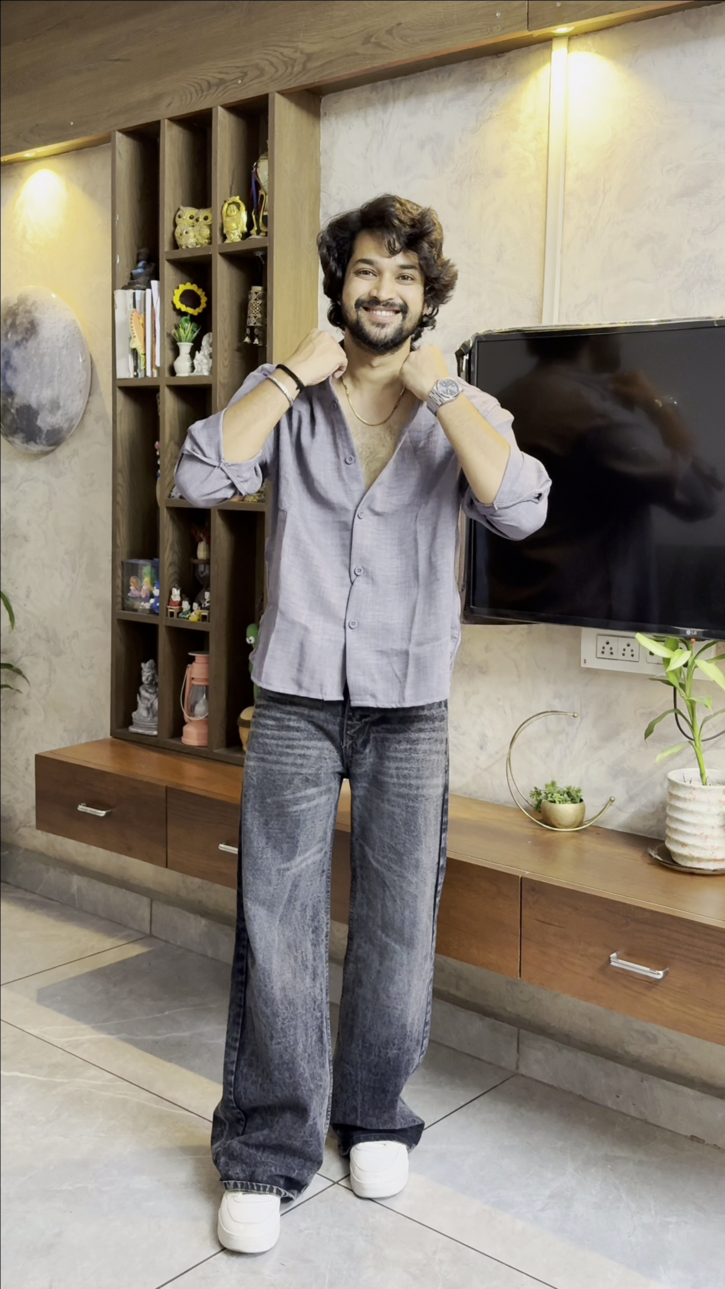 The Luxury Accent: Add a silver-tone watch and a simple gold chain to complement the cool undertones of the dusty amethyst fabric.