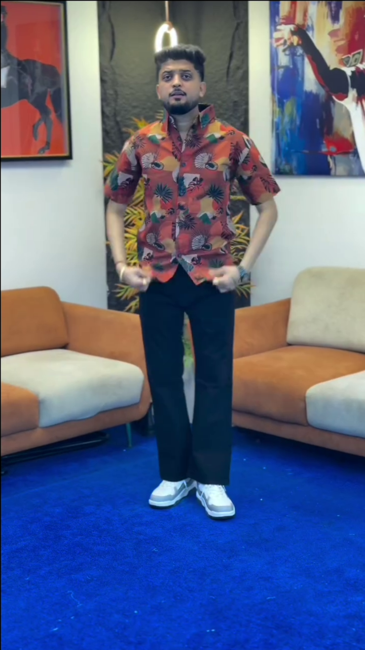 The Urban Anchor: Pair with slim-cut black denim or tailored charcoal trousers (as pictured) to allow the warm earth tones of the shirt to be the focal point.