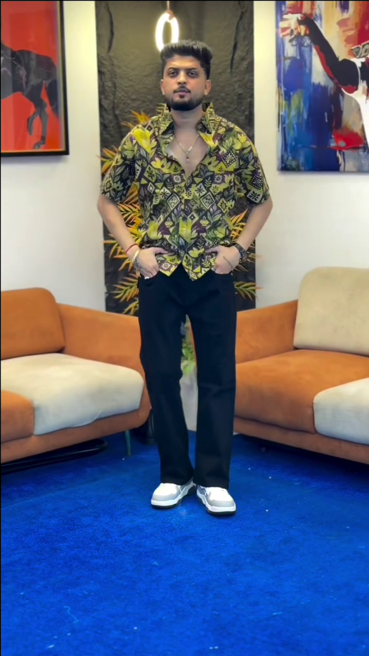 1. The Dark Contrast: Pair this vibrant top with slim-fit black denim or tailored black trousers to ground the greens and yellows, making the print truly “pop”.